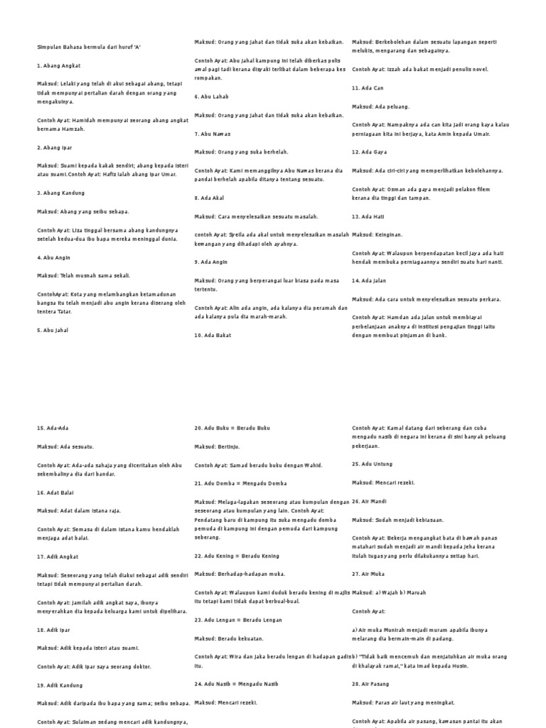 Simpulan Bahasa Huruf A / Tidak tahu membaca dan menulis.. (september 2017) (ketahui bagaimana dan bila untuk membuang pesanan templat ini) berikut ialah senarai peribahasa yang bermula dengan huruf n hingga z Darah dengan orang yang mengakuinya. Wikikamus bersaudara dengan ensiklopedia kandungan terbuka, wikipedia.edisi bahasa melayu ini dibuka pada 24 mei 2004, dan sudah mempunyai 8,165 lema. Hamidah mempunyai seorang abang angkat bernama hamzah. Simpulan bahasa harga diri ini membawa maksud: